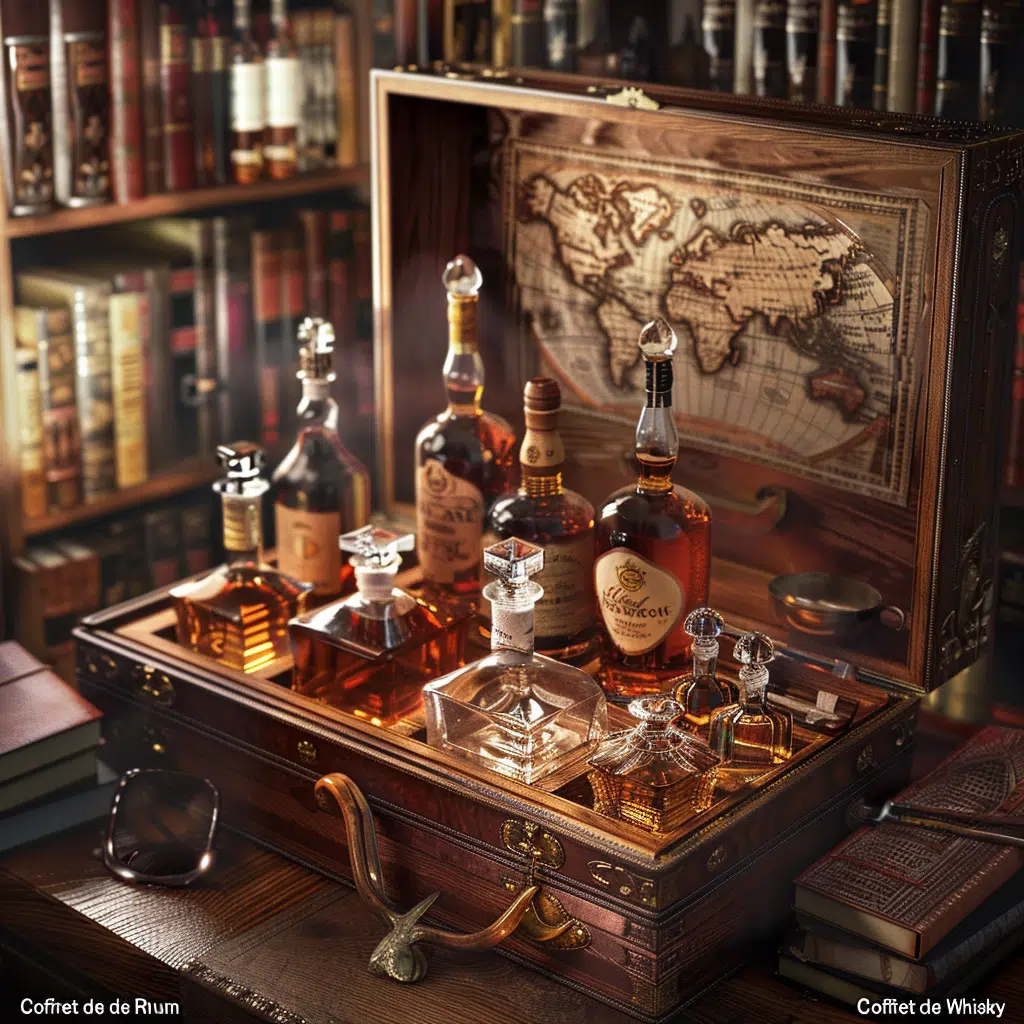 Contenu du coffret : Que ce soit pour un connaisseur ou un débutant, l'assortiment doit refléter les préférences du destinataire. Des collections mixtes, combinant _whiskies tourbés* et non tourbés, aux _rhums vieux et agricoles sélectionnés*, chaque choix doit être fait en fonction du profil gustatif de celui qui recevra le coffret.